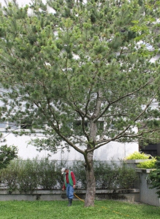 陳香伊說,目前松材線蟲尚無救治的方法,僅能及早做預防性的措施。一般林業單位常見的防治方法有:空中藥劑散佈、地上藥劑散佈、樹幹注射、感染源移除與處理,然而這些方式在實際操作上並不見得適用在校園內。基金會一向以最嚴謹的態度來執行每一個防治計畫,故在多種防治方式中,採用植物保護手冊所推薦的藥劑來進行預防性治療,透過土壤灌注的方式讓藥效從根部吸收,進而達到預防效果。此預防時效通常維持一年,每年都要再重複進行防治工作,才能對松樹達到最大的保護。 |