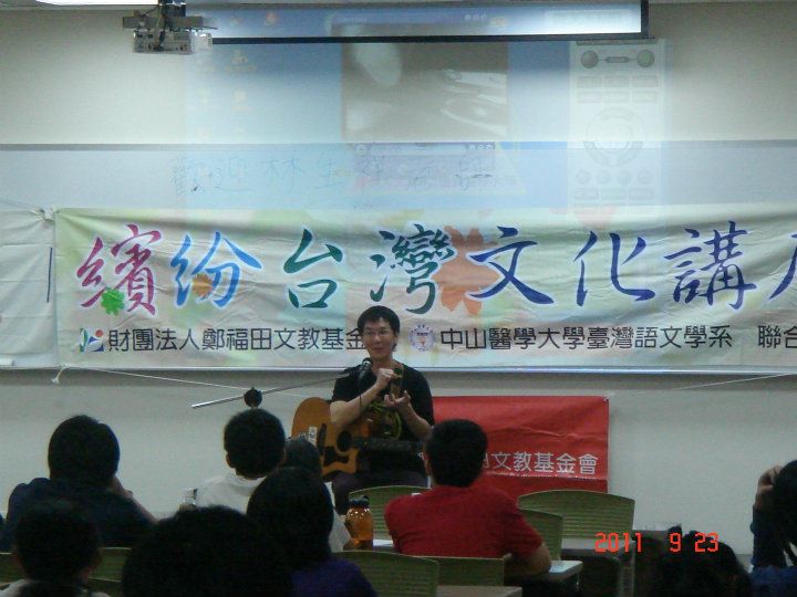 2011年9月23日~中山醫學大學正心樓~繽紛台灣文化講座下半年首場由林生祥講座主講<血濃於水,聽見土地在歌唱>。本會延續上半年的熱情,接下來的講座將帶給中部朋友不一樣的感受。